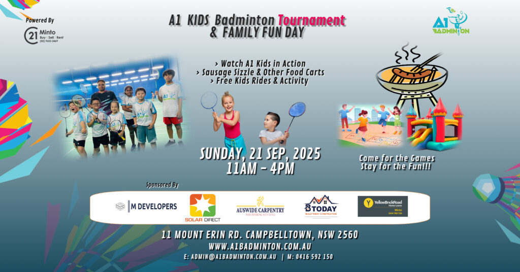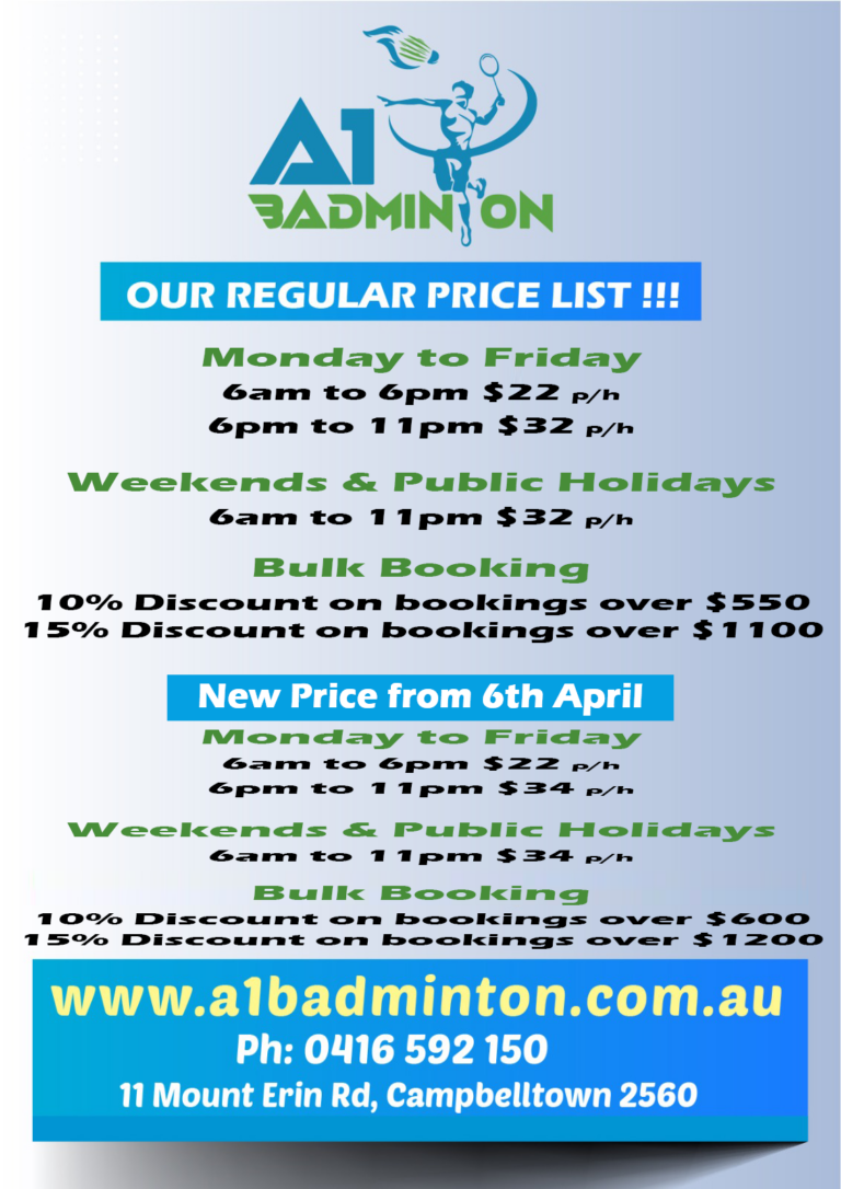 The A1 Badminton Centre is conveniently located in the heart of Campbelltown City, NSW that is South-West of Sydney. A short (10 to 20 mins) drive from Minto, Macquarie Fields, Ingleburn, Leumeah, Edmondson Park, Preston, Oran Park, Leppington and Liverpool.